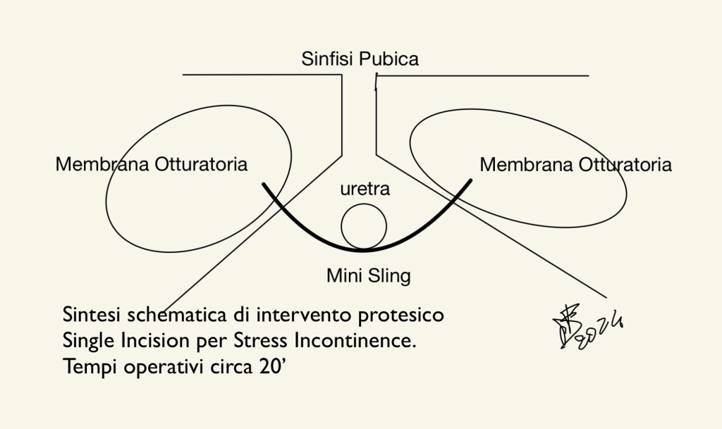 Tra queste tecniche noi abbiamo scelto quella più mini-invasiva, la cosiddetta “Mini-Sling Single-Incision”. Il nome stesso descrive le caratteristiche principali della perocedura chirurgica che adopera una benderella protesica altamente biocompatibile dalle dimensioni veramente piccole che viene inserita attraverso una piccola incisione (1 cm) sulla mucosa vaginale peri-uretrale. Attraverso questa incisione la piccola protesi come un’amaca sosterrà l’uretra andandosi bilateralmente ad agganciare alla membrana del forame otturatorio.